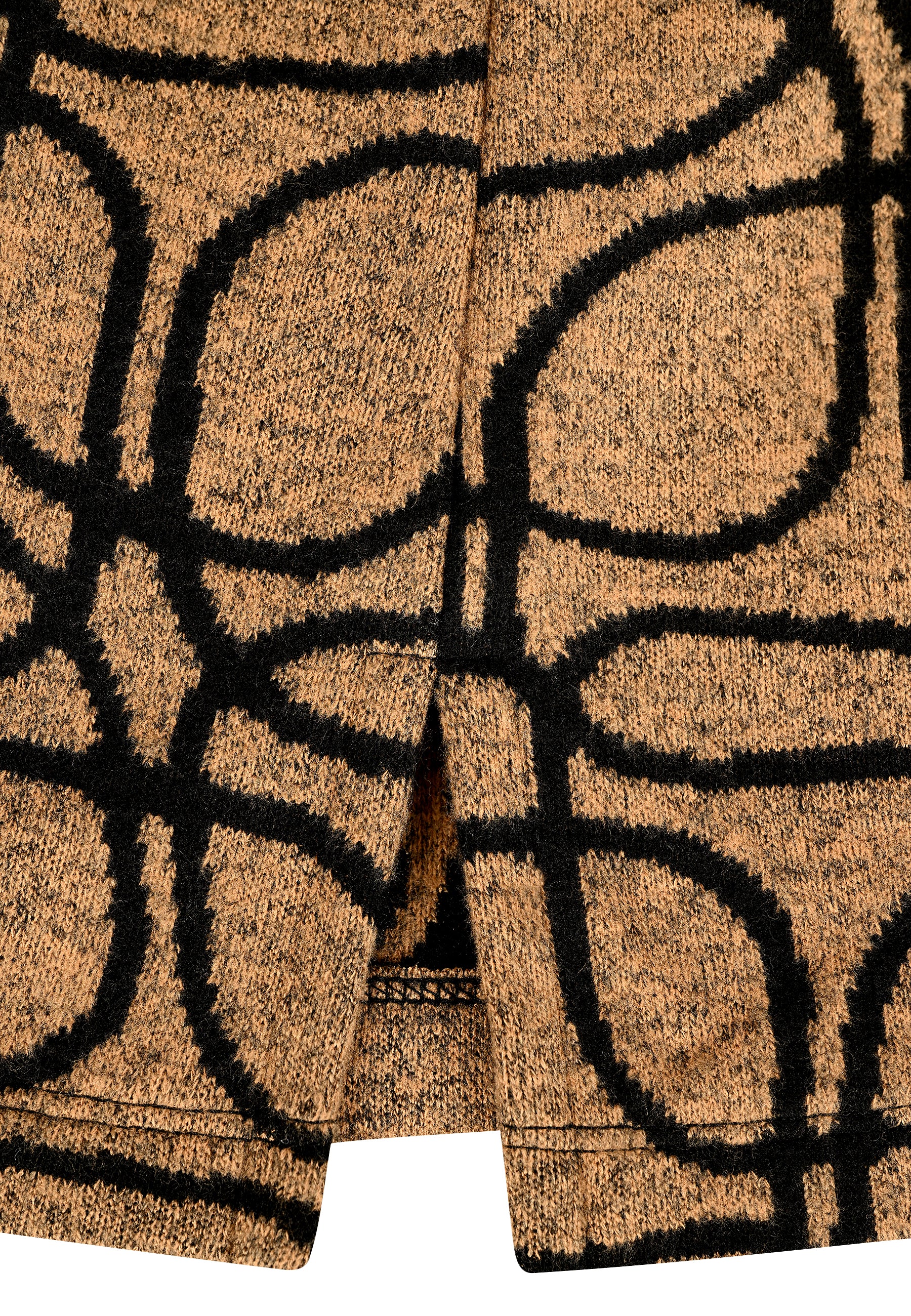 Dieser Pullover von elanza ist eine tolle Mischung aus legerem Sweater und klassischem Strickpullover. Locker im Schnitt, ist besonders der breite Stehkragen mit Bändchen ein echter Hingucker, der nicht nur modisch ist, sondern auch an kalten Tagen wärmt. Der Strick ist kuschelig voluminös und schenkt Ihnen den ganzen Tag pures Wohlfühlen. Mit seinem grafischen Jacquard-Muster in Schwarz auf braunem Grund, ist das Modell zudem super einfach zu stylen: Klassisch mit Stoffhose oder Rock, casual mit unserer elanza Comfort Fit-Denim. Ein Pullover, der einfach immer passt!