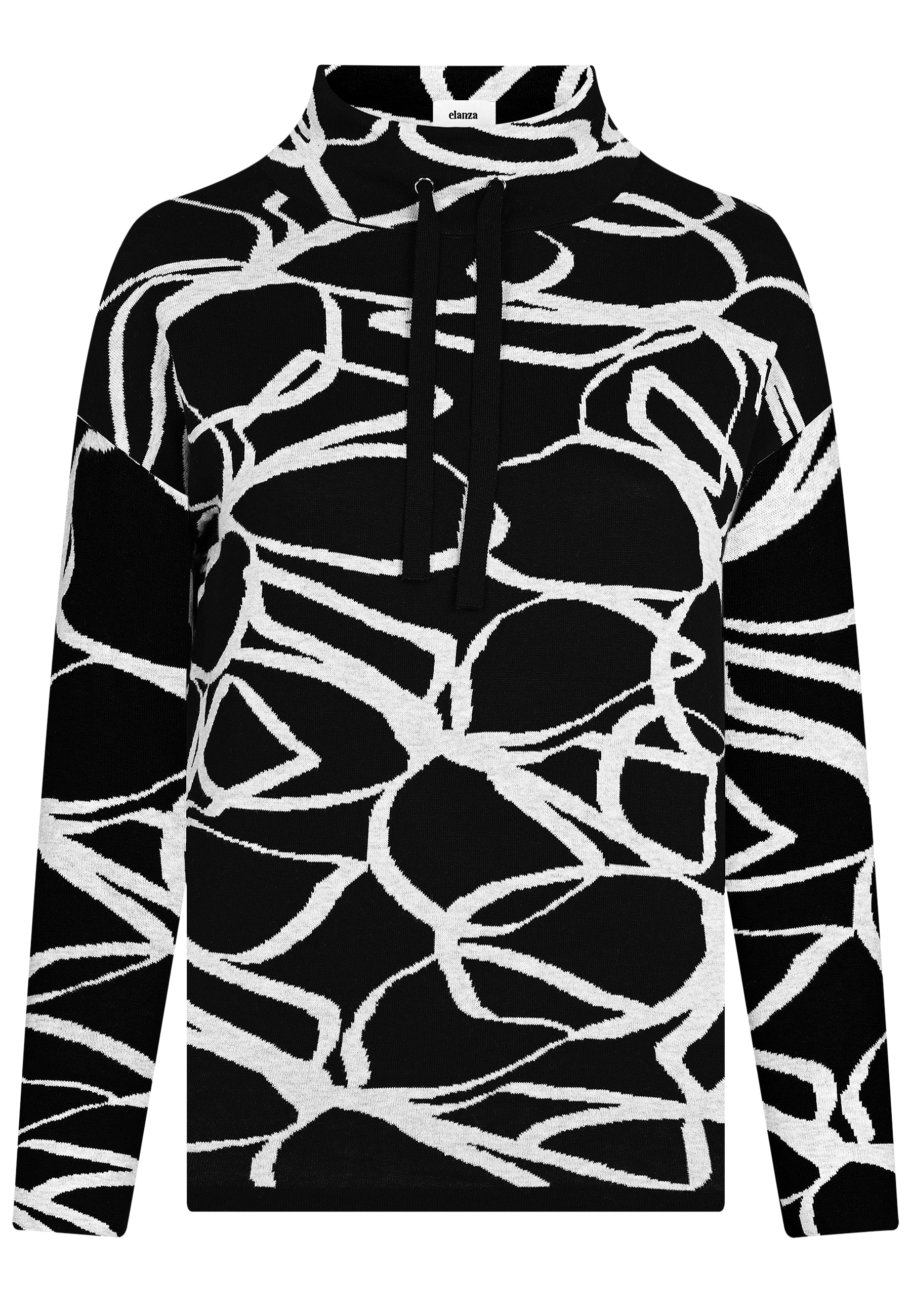 Locker im Schnitt und super angenehm im Material ist dieser Pullover ein exklusives Basic, das gemacht ist für alle, die Strick lieben, aber klassische Strickpullover zu warm und voluminös sind. Dank reiner Baumwolle, die zu einer glatten Qualität verarbeitet wurde, ist das Modell sehr hautfreundlich und ist besonders an langen Tagen eine gute Wahl. Hingucker ist der breite Stehkragen, der nicht zu halsnah geschnitten ist und mit einem Tunnelzug mit Bändchen nach Belieben in der Weite variiert werden kann. Das hochwertige Jacquard-Strickmuster in hellem Grau auf Schwarz verleiht dem Pullover einen modischen und zugleich zeitlosen Look. Ein absolutes Trend-Piece der Saison, das sowohl zu Jeans wie auch zu Röcken für einen hochwertigen und modischen Look sorgt.