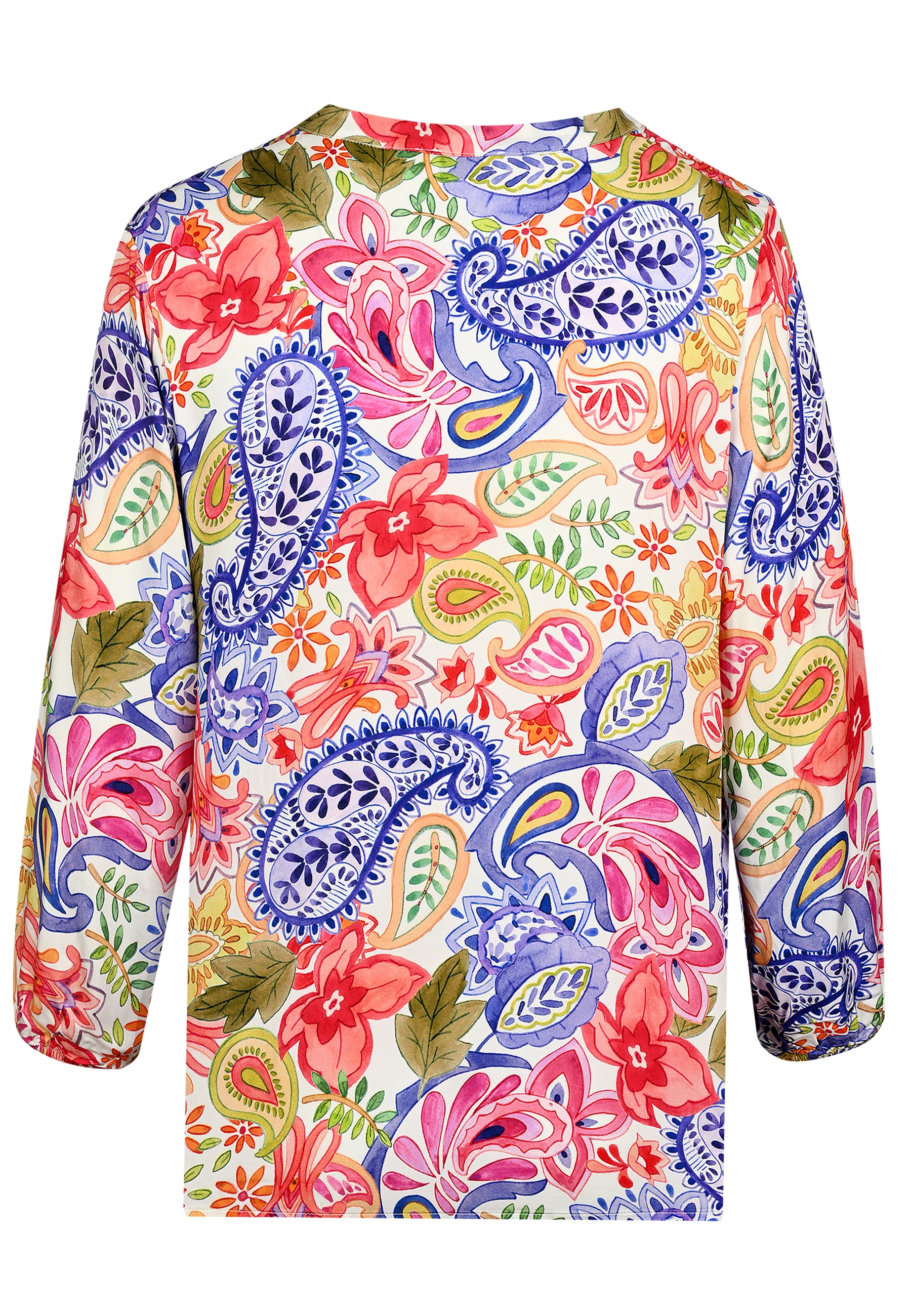 Hallo lente! Deze blouse doet verlangen naar warme dagen en is met zijn kleurrijke print een echte voorbode van de lente. De snit is aangenaam losjes, de zijsplitten in de zoom ondersteunen de casual look en de V-hals zorgt voor een vrouwelijke touch. Paars, roze, groen, oranje – geniet van de eerste warme dagen met deze blouse van zijdezacht viscose satijn en creëer je eerste lentelook met de elanza Comfort Jeans. Ontdek de nieuwe denimkleuren hier in de winkel!